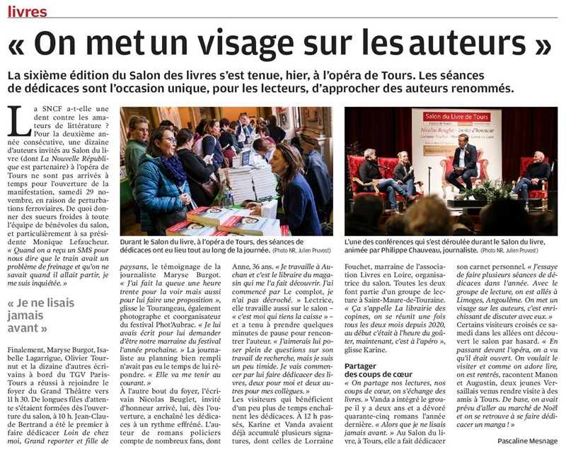 Article de La Nouvelle République pour la soirée littéraire du 5 mars 2020 avec Agnès Ledig