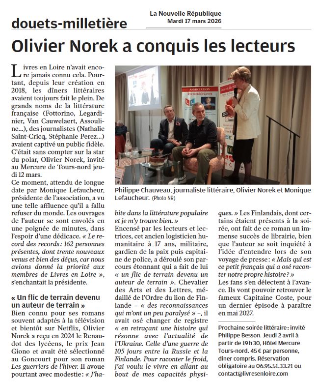Article de la Nouvelle République sur la soirée de Livres en Loire du 7 mars 2019 avec la présence de Lorraine Fouchet (marraine de l'association) et Valérie Gans. Philippe Chauveau, journaliste littéraire, avait mené les échanges
