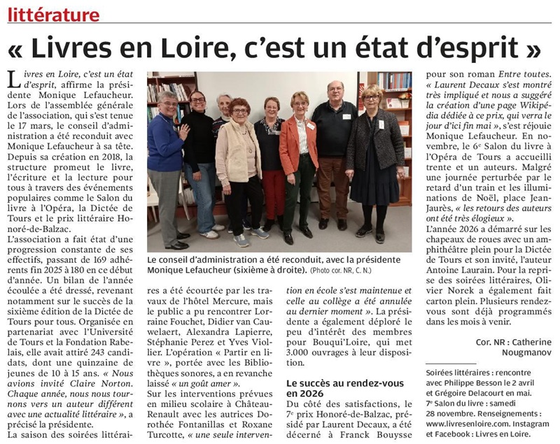 Article de la Nouvelle République sur la soirée de Livres en Loire du 7 mars 2019 avec la présence de Lorraine Fouchet (marraine de l'association) et Valérie Gans. Philippe Chauveau, journaliste littéraire, avait mené les échanges